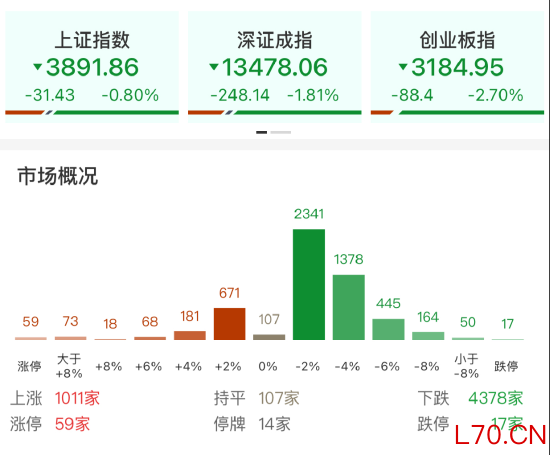 今日A股冲高回落,沪指下跌0.80%,深证成指下跌1.81%,创业板指下跌2.70%。沪深两市成交额约2.01万亿元,较前一个交易日略有放量。个股跌多涨少,全市场超4300只个股下跌。行业层面,汽车、医药、高铁等板块涨幅居前;煤炭、电解液、光模块等板块则跌幅明显。
