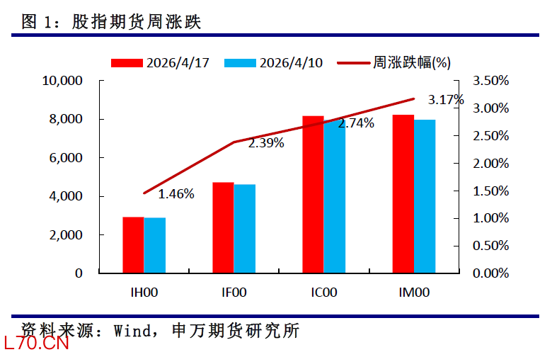 本周股指继续上涨,IH260变化1.46%,IF2604变化2.39%,IC2604变化2.74%,IM2604变化3.17%。