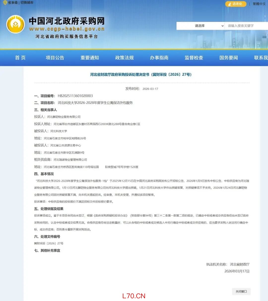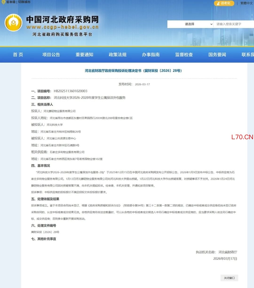 近日,河北省财政厅发布两份政府采购投诉处理决定书(冀财采投〔2026〕27号、28号),认定河北科技大学2026-2028年度学生公寓保洁外包服务项目两个包的中标结果无效。该项目预算总额为741.5万元,采购方式为公开招标。