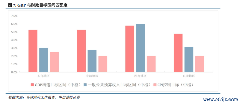 中部地区GDP目标均值为5.1%,财政收入目标均值仅为2.8%,差值达到-2.3个百分点。GDP设定保持稳定区间,但财政目标明显审慎,反映出在制造业利润承压与地产收入回落背景下,地方财政对收入弹性保持谨慎预期。中部作为制造业承接与内需支撑区域,其增长质量与税基修复节奏高度相关,财政匹配度的提升有赖于产业盈利能力改善。