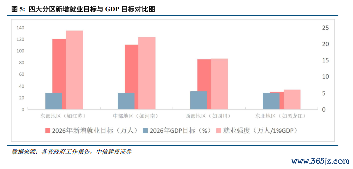 就业目标是衡量增长质量与社会承载能力的重要指标。根据四大分区新增就业目标与GDP目标对比表,可以进一步构建“就业密度”指标(新增就业万人数 / 1% GDP增长),从而观察不同区域增长的就业吸纳能力。