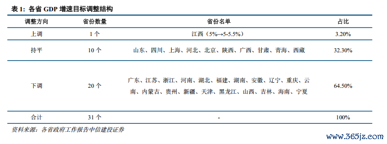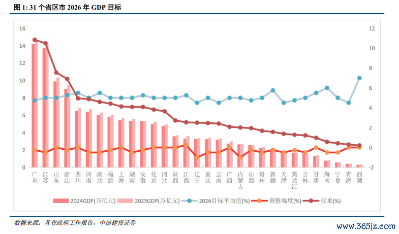 结构上看,2026年地方两会GDP目标加权平均值为5.03%,多数省份目标下调或区间化,体现务实审慎取向。21个省市下调目标,9个省市持平,仅江西上调。
