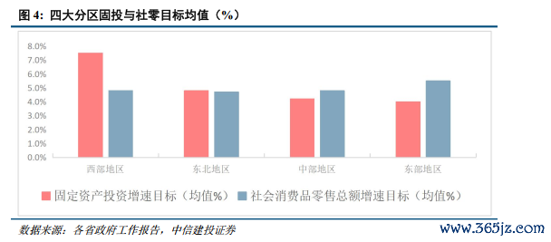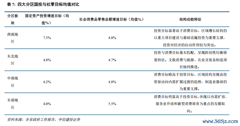 进一步结合四大分区固投与社零目标均值对比表,可以观察到投资与消费在区域增长结构中的权重差异。