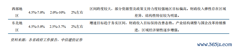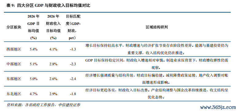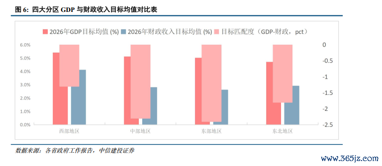 根据四大分区GDP与财政收入目标均值对比表,四大分区均呈现出GDP增速目标高于财政收入增速目标的结构性特征,但差异程度不同。西部地区2026年GDP目标均值为5.4%,财政收入目标均值为4.1%,两者差值约-1.3个百分点。虽然存在一定“剪刀差”,但幅度相对温和。结合区域发展特征来看,西部增长仍以能源、基建与战略项目为主要支撑,财政收入结构优化仍在推进阶段,收入弹性尚未完全释放。这种结构意味着增长扩张与财政修复之间仍需时间匹配。