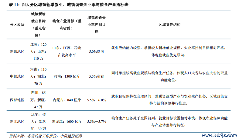 在财政约束环境下,民生与安全底线成为检验地方增长责任的重要维度。根据四大分区就业与粮食底线指标表,可以从就业、粮食生产与失业率控制三个方面观察区域责任结构。