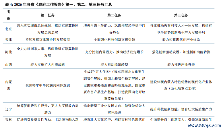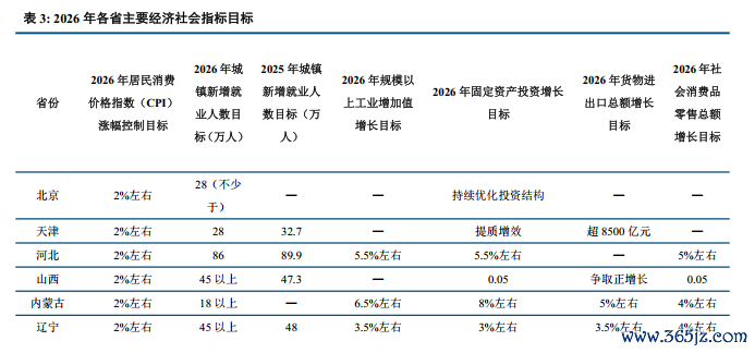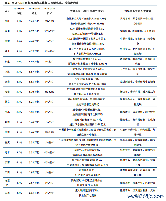 区域层面,四大经济板块发展各有侧重,形成功能互补的梯度结构:东部地区目标围绕5%左右,以消费扩容和创新驱动为核心;中部地区目标维持在5%-5.5%,突出制造业承接与内循环枢纽功能;西部地区目标相对偏高,以基建投资和资源转化为支撑;东北地区目标在4.5%-5%之间,更侧重内需修复与特色产业突破(如冰雪经济、粮食安全),呈现“修复型”增长特征。总体而言,2026年地方两会的经济工作逻辑已从总量扩张转向功能分工与结构优化。目标设定更加务实,工作重点更加聚焦,通过区域间的差异化布局和协同,为“十四五”圆满收官与“十五五”稳健开局夯实了兼具韧性与质量的基础。