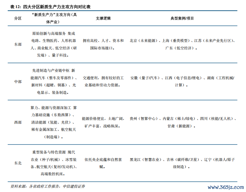 根据四大分区新质生产力主攻方向对比表,四大分区在新质生产力布局上呈现出“研发端—制造端—算力端—资源端”的分化格局。