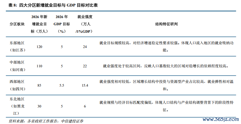 东部地区(如江苏)新增就业目标约120万人,对应GDP目标约5%,就业强度约24万人/1%GDP。较高的就业密度反映出人口流入地区对就业扩张的刚性需求,同时也意味着东部增长对就业稳定性的依赖程度较高。服务业与先进制造业对就业的吸纳能力较强。