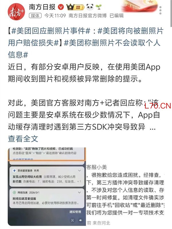 从网上的各种报道可以看出来,美团删照片几乎是在用户不知情的情况下完成的,有不少人甚至还是手机弹出拦截通知之后才发现的。