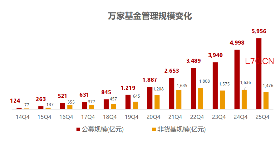 万家基金成立逾23年,在主动权益业务持续壮大的同时,也在加速布局被动指数、FOF、固收+等方向。据银河证券统计,截至2025年末,万家基金资产管理总规模达6089.44亿元,其中公募基金管理规模为5956亿元,非货基管理规模为1475.76亿元,排名行业第24/164名。自2015年以来,其公募基金管理规模增长超47倍,非货基管理规模增长超18倍。