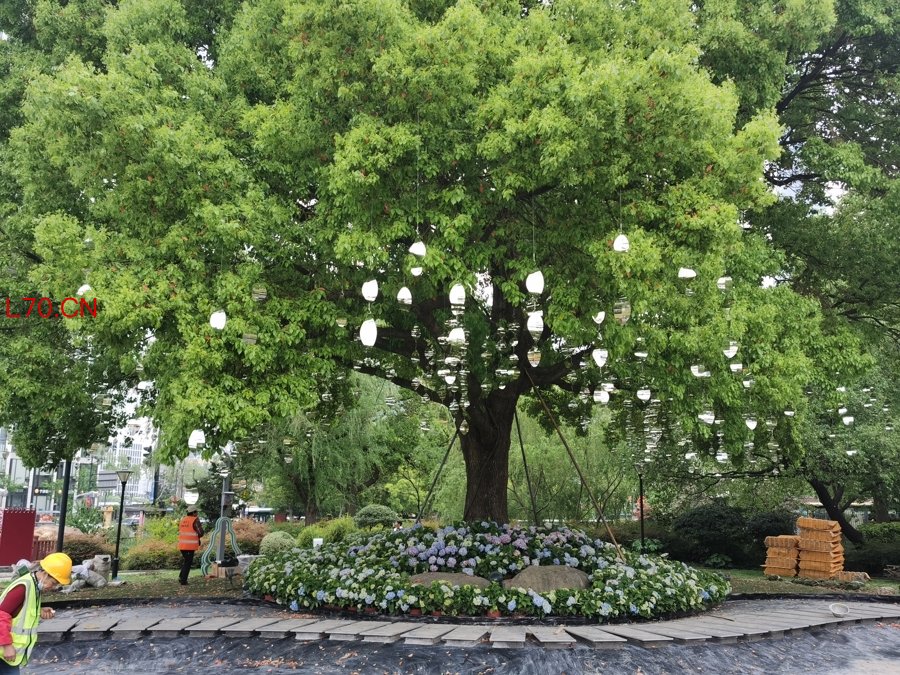 来公园看场地时,李中伟一眼相中园中一棵大香樟:“它能让我用最简单的方式产生网红效应。”记者注意到,这棵香樟树下补种了一片绣球花,在树前空地挖土后铺上防水袋做了一个临时的水塘,树上挂了几十串风铃,此外再无其他布置。