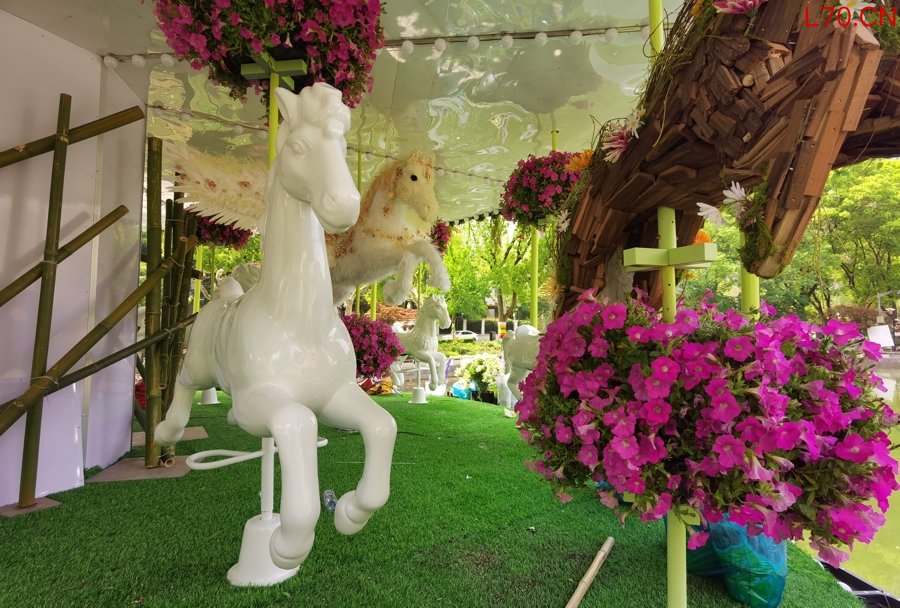记者注意到,现场有15匹木马,其中10匹是可以互动的普通木马,还有5匹是特别设计过的,比如红色的“花木兰”铁马、粉色的绒毛独角兽、身披白色婚纱的飞马新娘。
