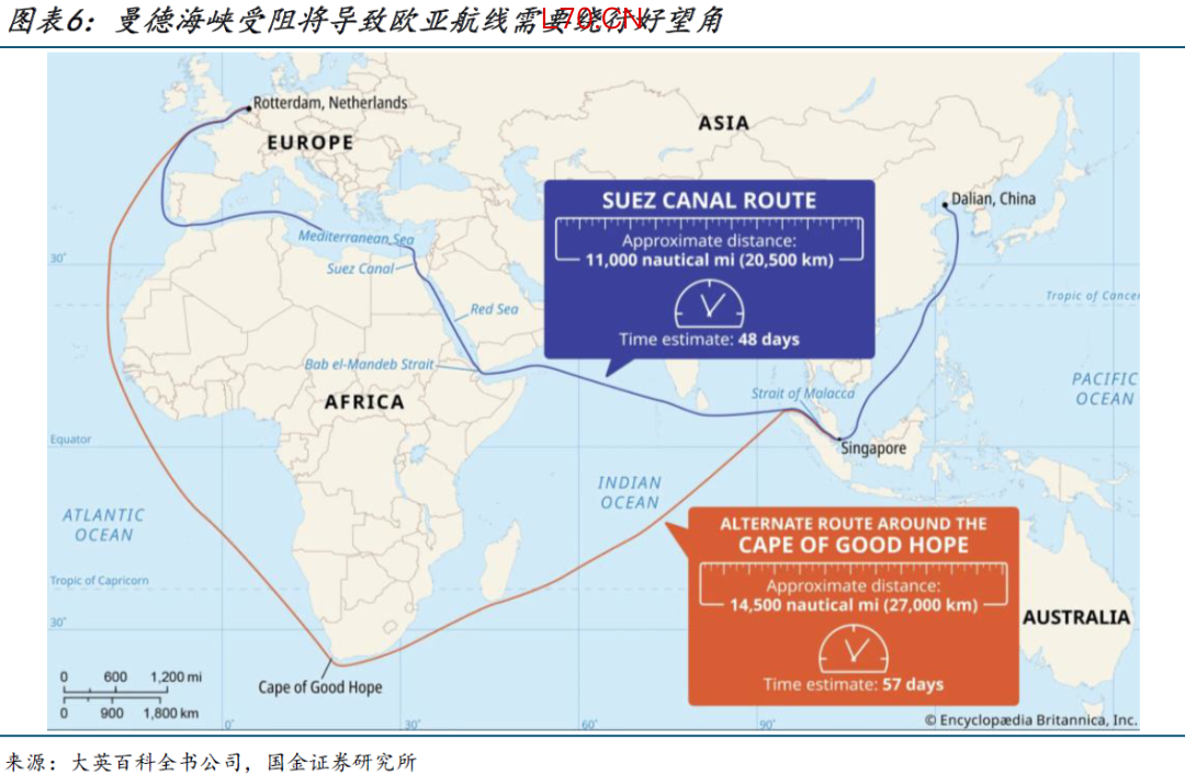 无论是哪种登陆战形式,都有可能触发胡塞武装加入战场。如果胡塞尝试封锁曼德海峡,意味着承载全球12%海运贸易量、连通欧亚的“亚丁湾-曼德海峡-红海-苏伊士运河-地中海”航路面临阻断风险,航运需要绕行非洲好望角,将进一步推升运价、物价、降低供应链效率。