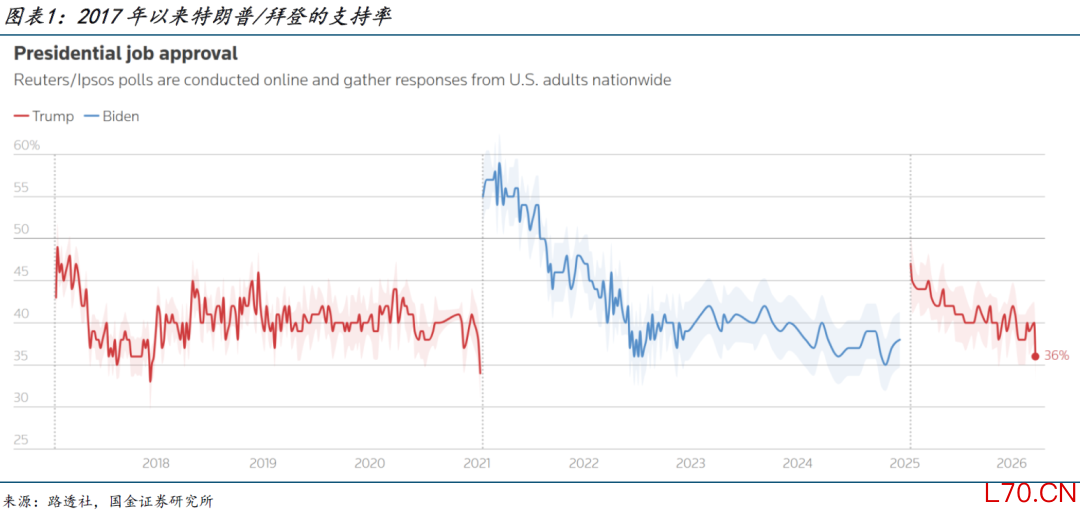 时间不在特朗普这边。油价上涨已经严重冲击了特朗普的选情,路透/益普索的最新民调显示,特朗普的支持率大幅下降至36%,创下第二任期以来的新低,持平于2020年大选共和党被横扫、2024年大选民主党被横扫之前的水平。Polymarket显示共和党在今年中选被横扫的概率上升至50%左右,至少丢失众议院几乎是板上钉钉。战争每持续一天,海峡每封锁一天,原油供需缺口就增加上千万桶,油价随时间升高,特朗普的境遇愈发不利。