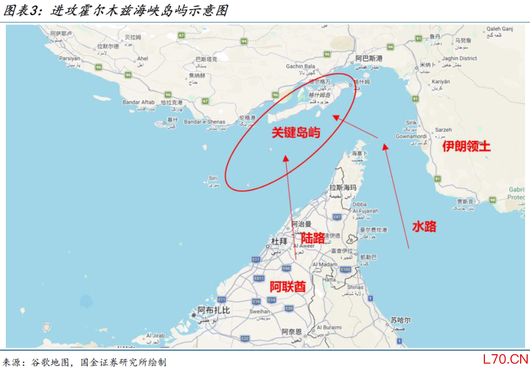 控制海峡的关键是海峡西侧的几个重要岛屿,包括格什姆岛、阿布穆萨岛、大/小通布岛。如果走水路,在经过海峡东侧时会路过伊朗领土,面临被攻击的风险。如果走陆路,虽然可以直抵海峡西侧,需却要借助阿联酋等海湾国家的领土甚至两栖船,可能被伊朗认定为介入战争。伊朗议会发言人近日称,“情报显示伊朗的敌人正计划在一个地区国家的支持下占领伊朗的一个岛屿,若对方采取任何行动,伊朗将攻击该地区国家的关键设施”。考虑到阿联酋在阿布穆萨岛和大/小通布岛与伊朗存在领土争议,被卷入其中是有可能的。