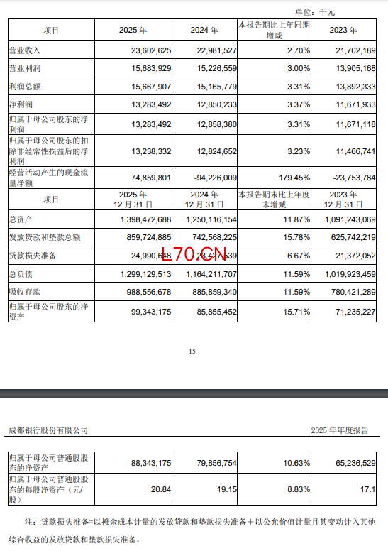 成都银行:2025年实现营业收入236.03亿元,同比增长2.7%