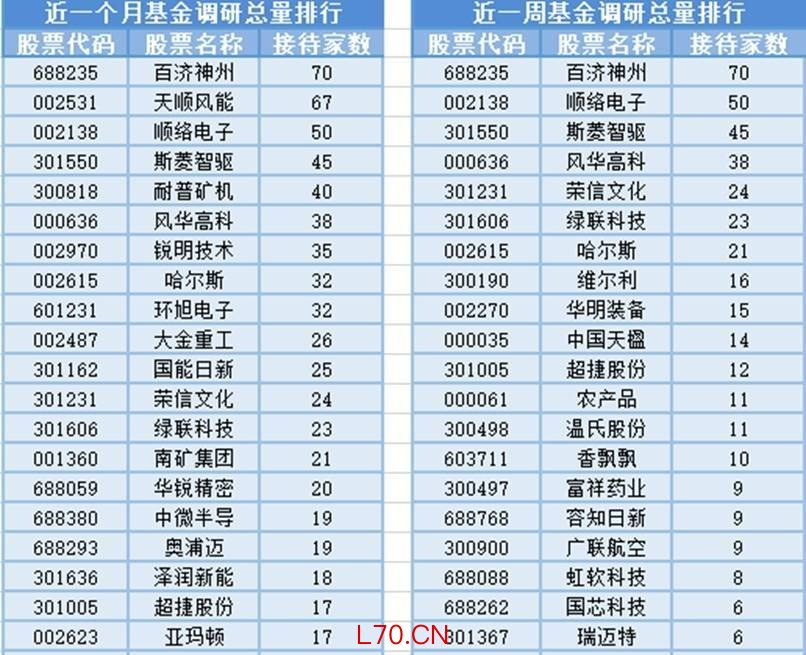 从个股调研情况上来看,最近1个月(2月1日-3月3日)最受公募基金关注的是百济神州,百济神州属于化学制药行业,主营业务为研究、开发、生产以及商业化创新型药物。共有70家基金管理公司参与调研,其次是天顺风能和顺络电子,分别接受67家、50家基金管理公司的调研。