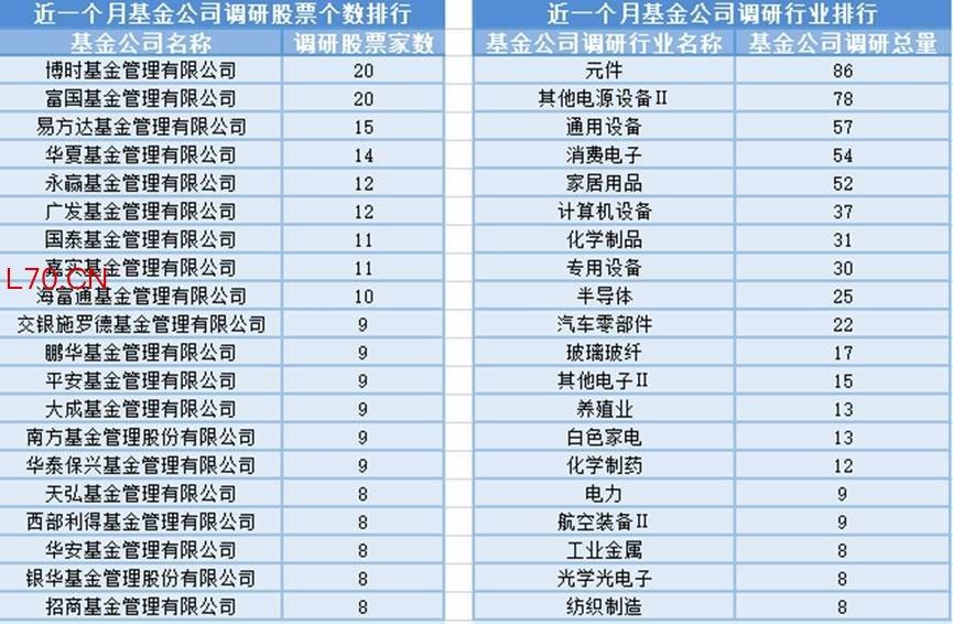 近一个月(2月1日-3月3日),博时基金参与公司调研的数量最多,共调研20家上市公司,此外调研较为活跃的还有富国基金、易方达基金和华夏基金,分别调研20家、15家、14家上市公司;从调研行业上来看,基金公司对元件行业的上市公司调研次数最多,共有86次,其次是其他电源设备Ⅱ行业,基金公司调研了78次。
